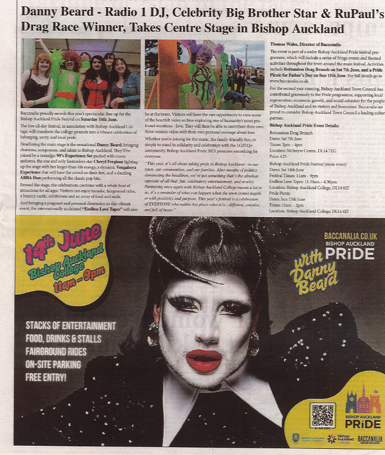 Baccanalia proudly unveils this year’s spectacular line-up for the Bishop Auckland Pride Festival on Saturday 14th June.