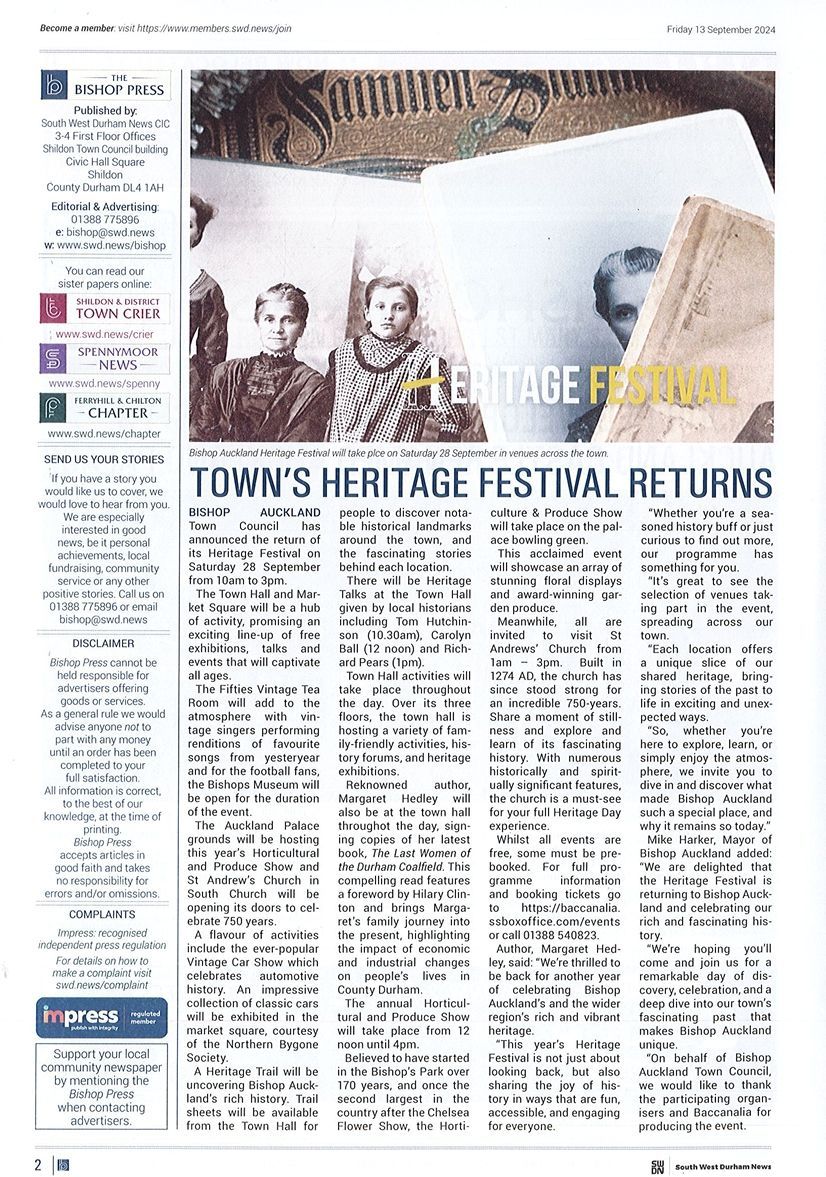 Bishop Auckland Town Council has announced the return of its Heritage Festival on Saturday 28 September from 10am to 3pm.